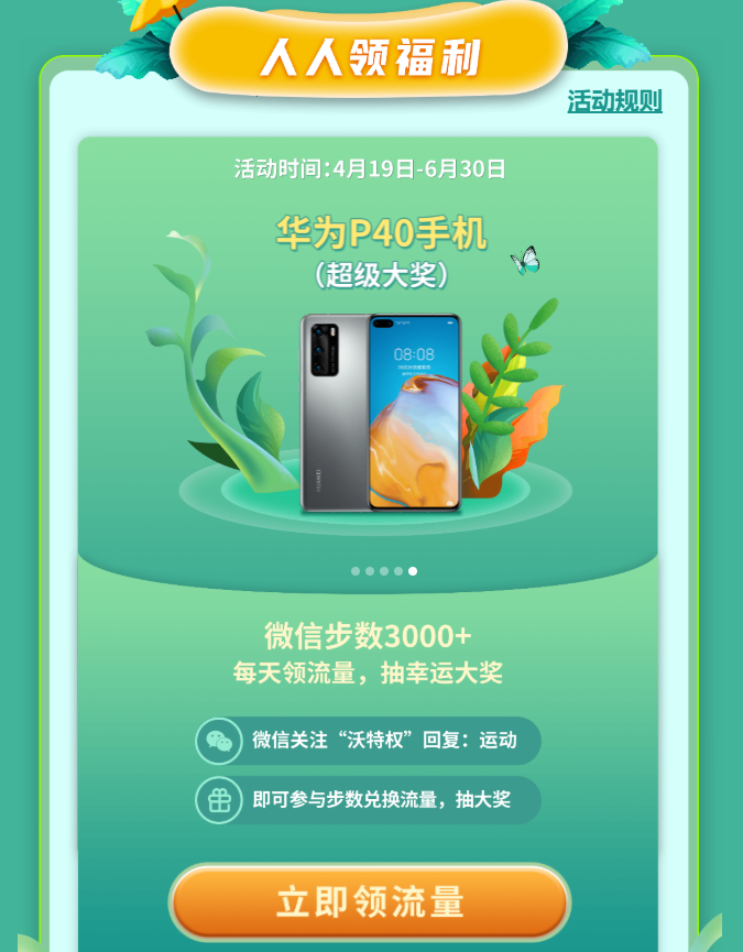 移动和电信用户能不能参与呢?答案是:可以。但是并不获赠流量,三网用户参与这个活动,都可以参加抽华为 P40手机。除了华为手机,还有40元京东E卡、煮蛋器、电煮锅(华为只有一份,留给欧皇,这些小奖还是更值得期待)。参与的方式:微信关注“沃特权公众号”,回复“运动”。