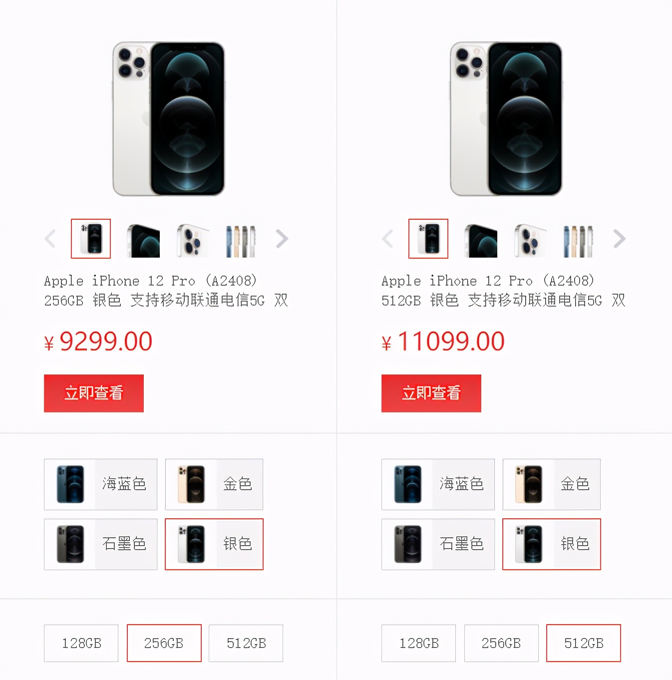 就拿iPhone 12 Pro来说,256GB存储空间的iPhone 12 Pro售价是9299元,而512GB存储空间的iPhone 12 Pro售价是11099元,相差1800元。
