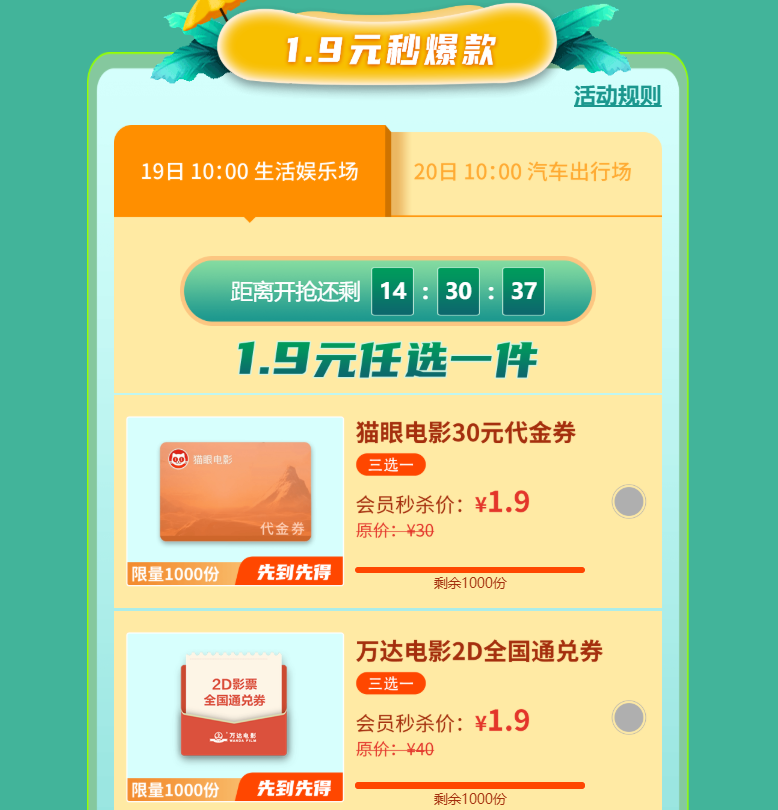 最后就是4月19日和20日10点开抢的1.9元秒爆款的活动了,是联通PLUS会员日的一个重磅活动,提供1.9元秒打车券、电影券、共享单车月卡、京东E卡、还有洗车券,薅流量的同时,也值得关注一下这项活动。
