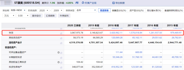 同花顺iFind数据显示,2018、2019、2020前三季度,ST康美的存货数值为342.10亿元、314.08亿元、306.80亿元,虽然在逐年减少,但相比此次203亿元的调整均属于“微不足道”。