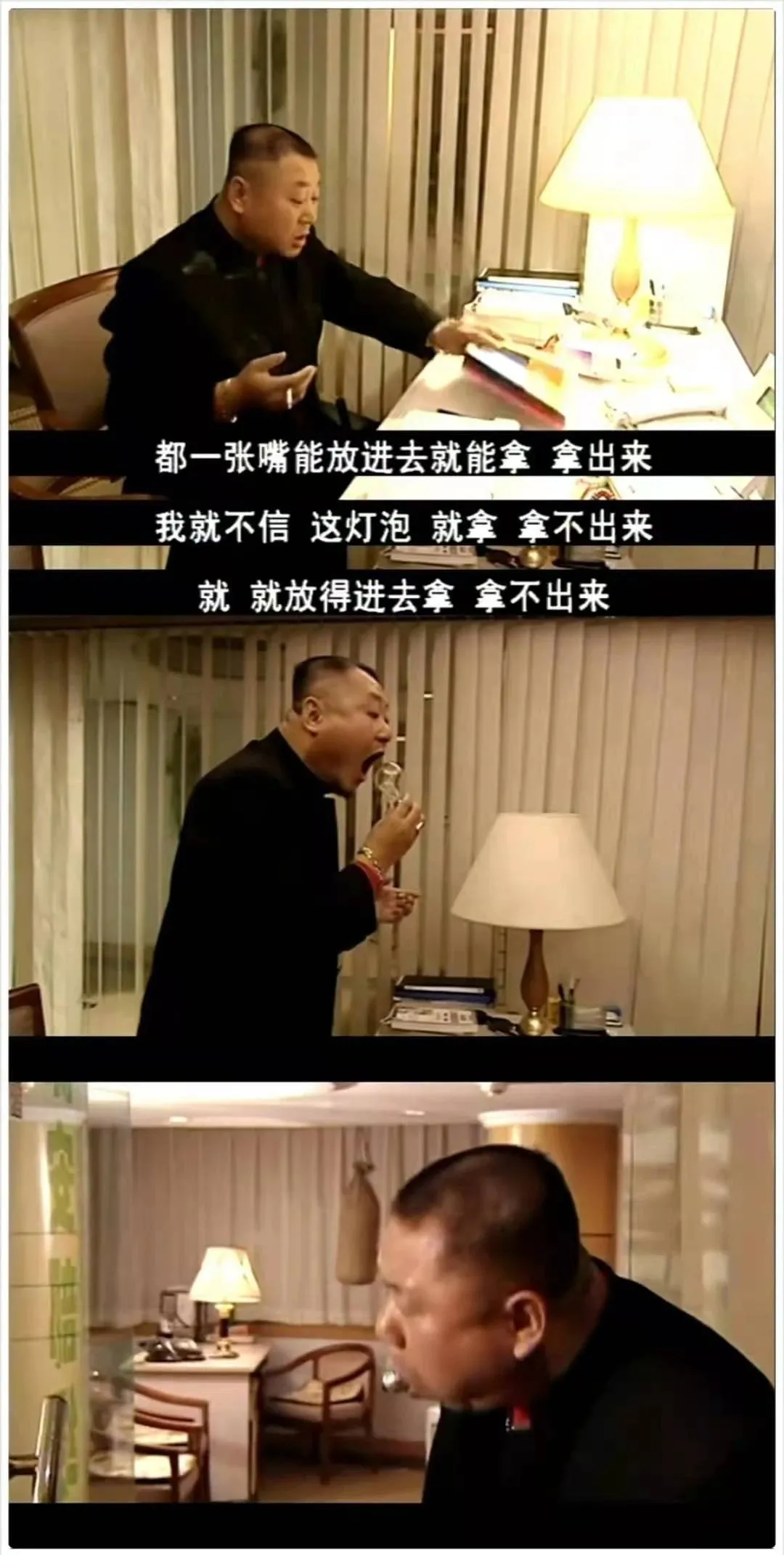一个灯泡一张嘴,能放进去就能拿出来,德彪觉得自己行,非得亲身试验。最后结果就是德彪再次败北,只能去医院求助医生。