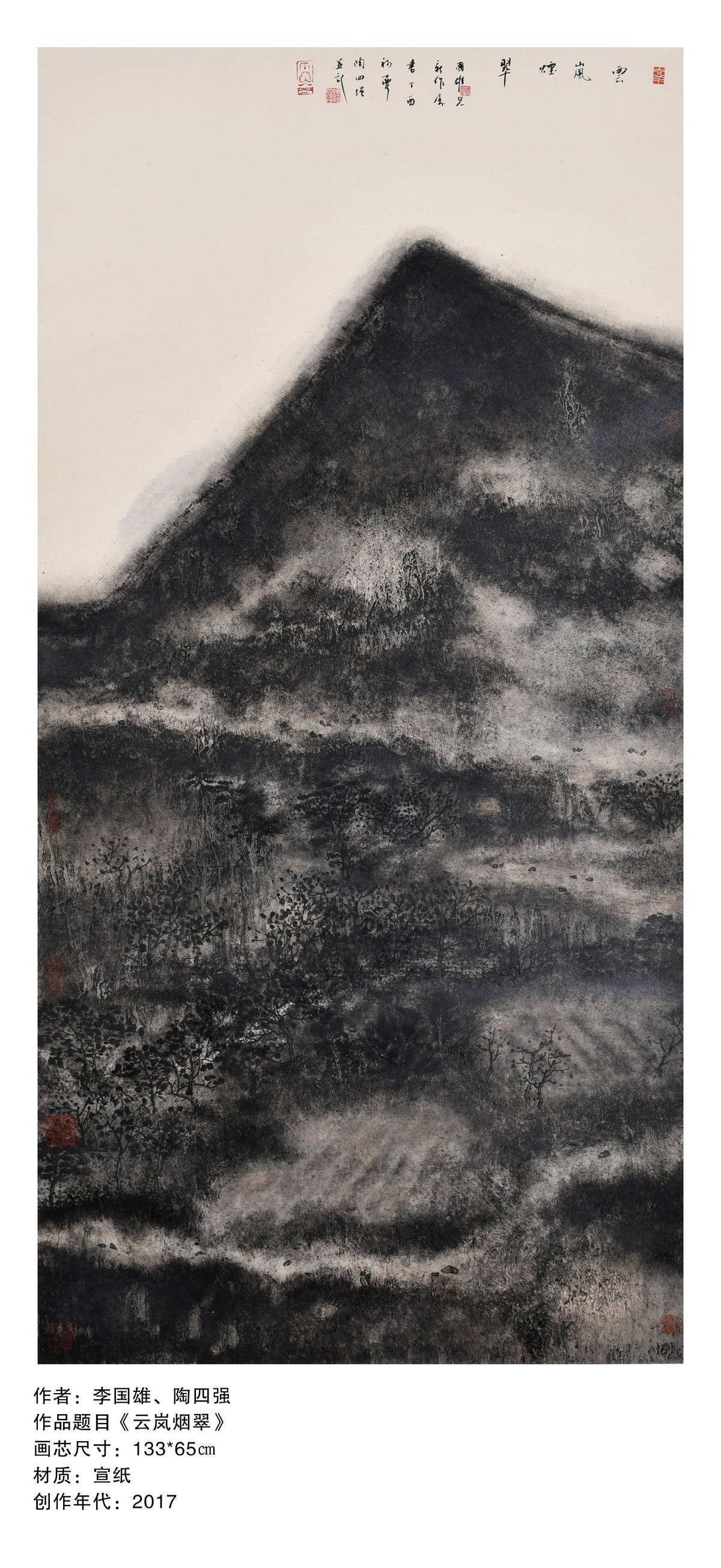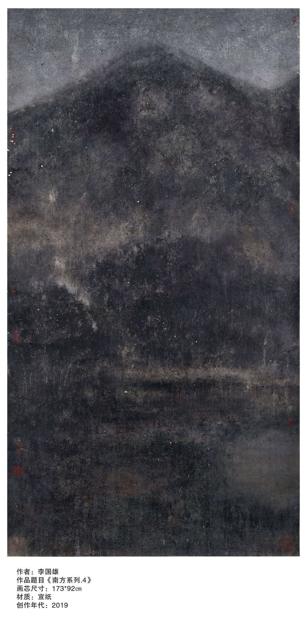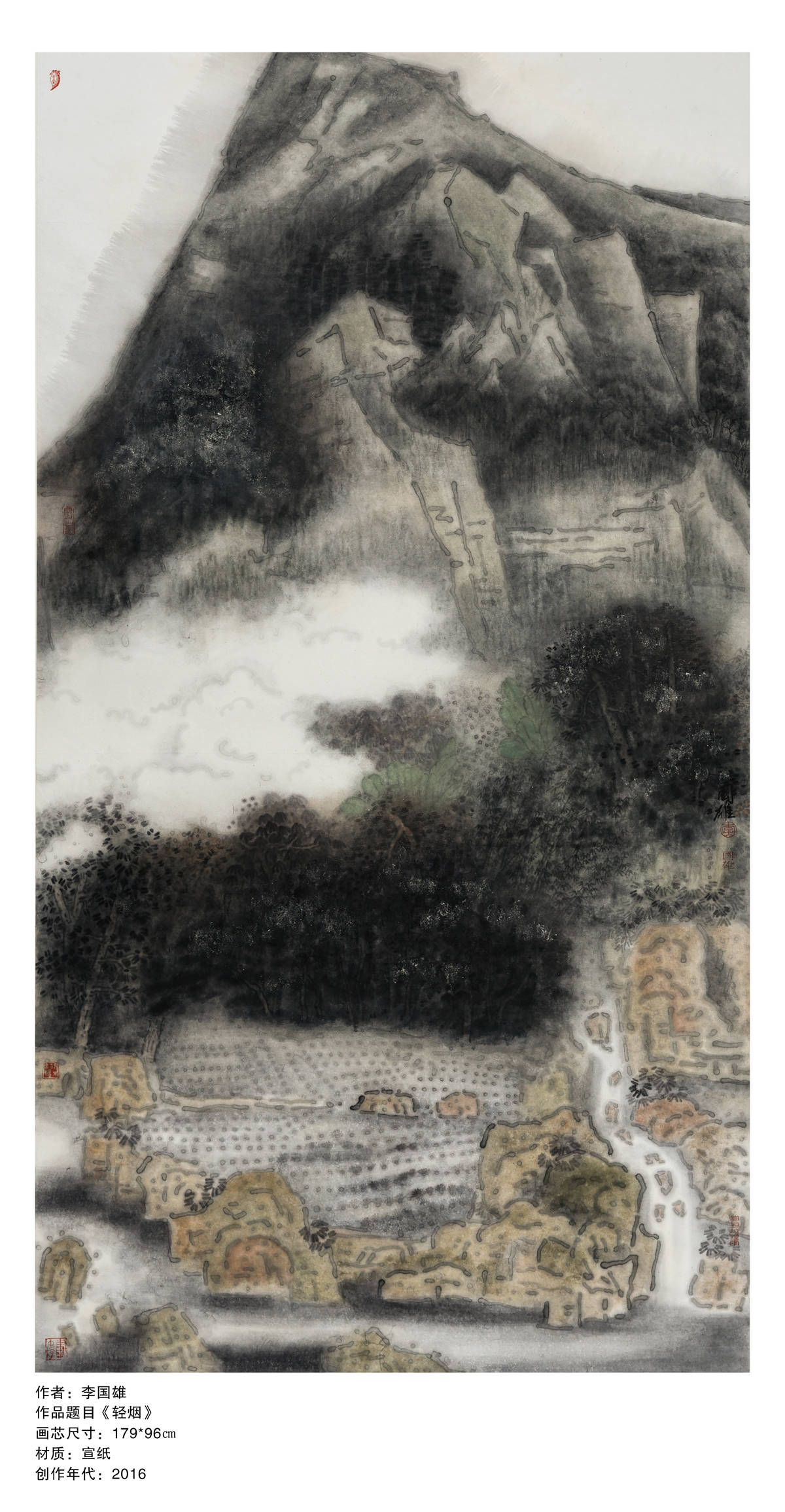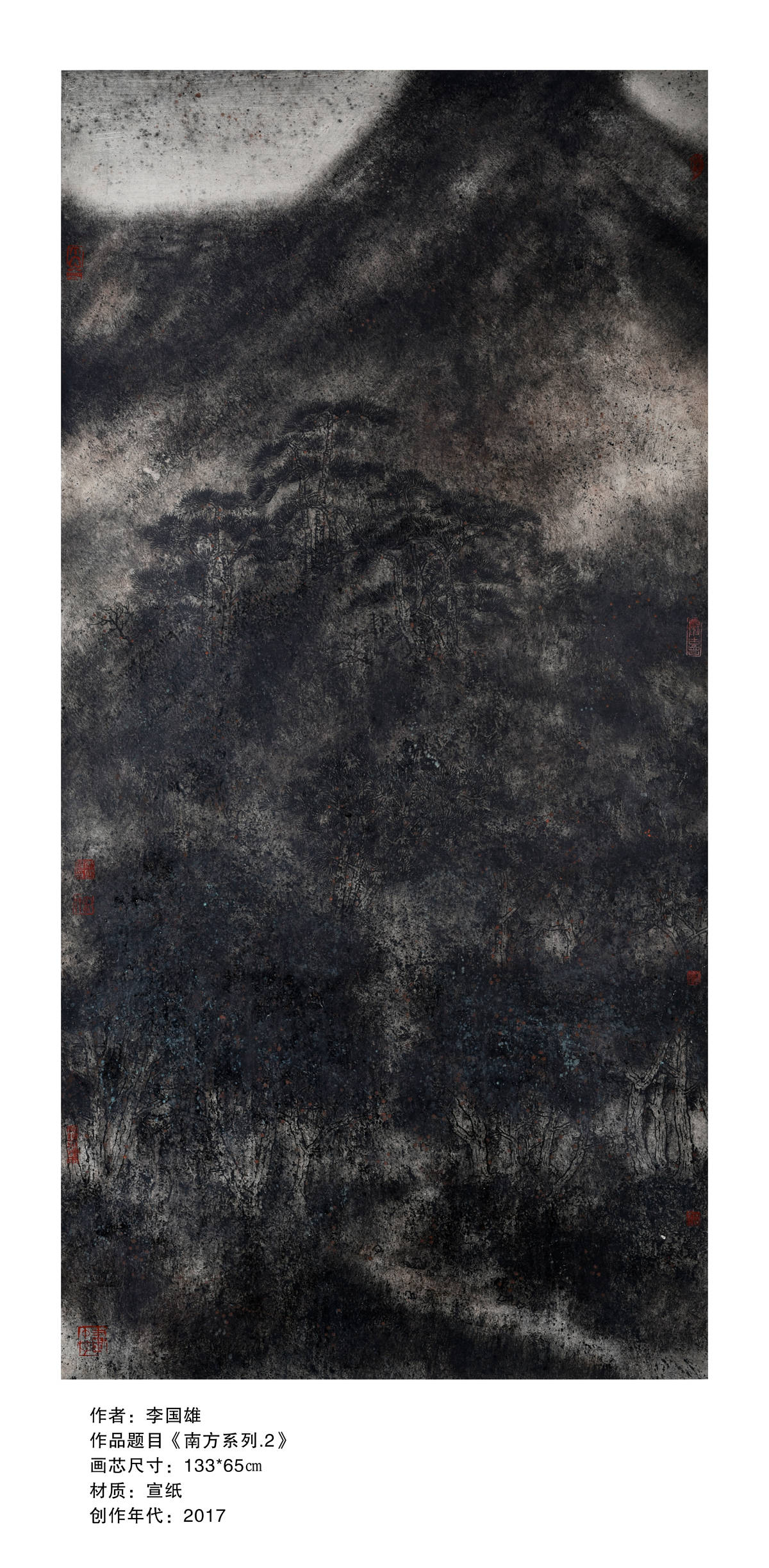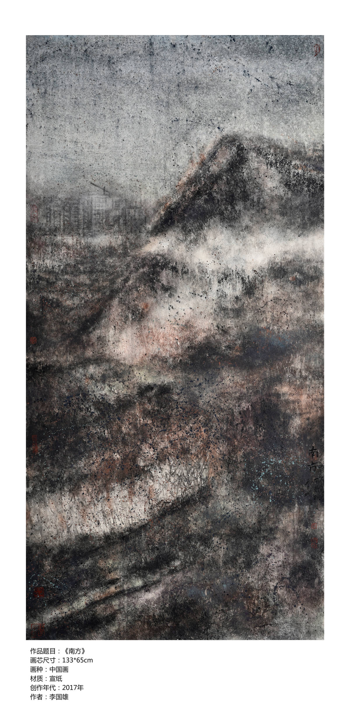 2017年在中国美术家协会会员黄远明先生的带动下,策划“融.一样不一样” 寇雁鸣、黄远明、王振邦、李富强、李国雄、李子杰———六人作品展,这个展学术性很高,寇雁鸣和黄远明两位都是中国美术家协会会员,让我的压力很大,有压力自然有动力,创作出作品《烟云供养》《南方》等的佳作,素材来源鹤山市大雁山风景区周围,前者表现农业耕种,后者表现在建筑工程高速发展,技法上运用了“没骨画法”,画面上有块面感,有厚重感,有视觉冲击力效果,用渲染手法表现出天和地的气氛,突显南方气候随时随地的变化,增添画面气氛。《烟云供养》入选十三届广东省艺术节优秀美术作品展,《南方》参加江门市美术家协会年度展获———学术奖。作品《南方》2018年参加“第四届广东岭南美术大展”获优秀奖。