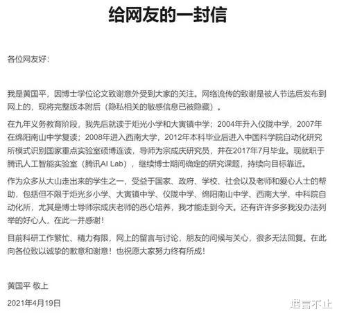 黄国平自己也通过媒体发表了一封简短的回信。