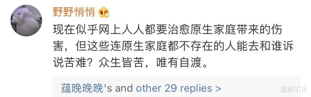 “现在似乎网上人人都要治愈原生家庭带来的伤害,但这些连原生家庭都没有的人能去和谁诉说苦难?众生皆苦,唯有自渡。”