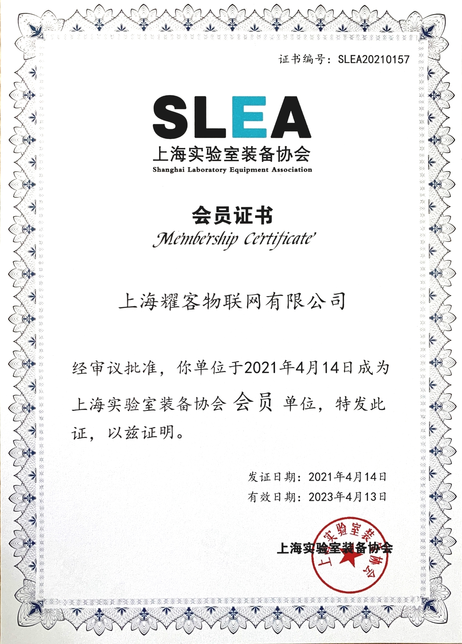 日前,上海市实验室装备协会向上海耀客物联网有限公司颁发了会员证书。
