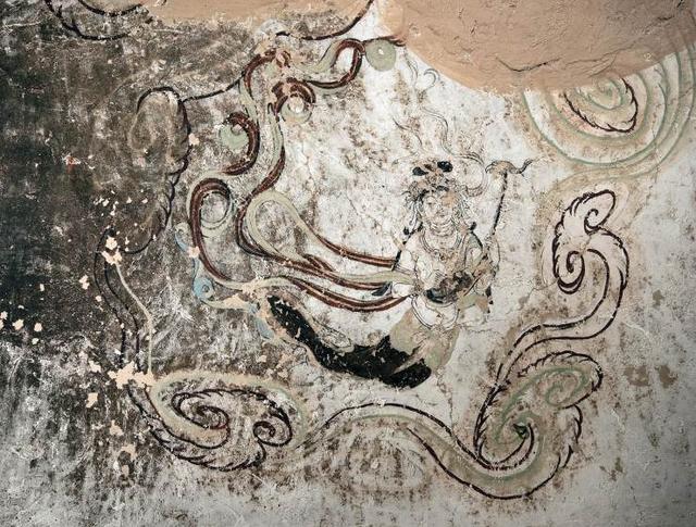 绘于榆林窟第10窟窟顶西披下沿,由飞天乐伎手持。在这幅西夏时期壁画中,有件乐器琴头卷曲,呈“?”形,无琴轴,琴身呈上下宽、中间窄的流线型,琴筒正下方有琴身延长出的突起。从图像呈现,尤其是乐伎的手持方式看来,这是一件拉弦乐器,具体应为至晚在唐代开始流传的“奚琴”,宋、西夏时被称为“嵇琴”。壁画中的乐器绘制得十分完整和精美,是敦煌壁画中极为难得的一幅嵇琴图像。