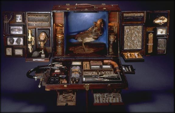 这让我想到了好奇柜的另一个衍生概念,即为“移动的博物馆”。1994年,艺术家罗恩·皮平创作出了下图中的艺术品。好奇柜被装进了手提箱中,好像移动着展示。
