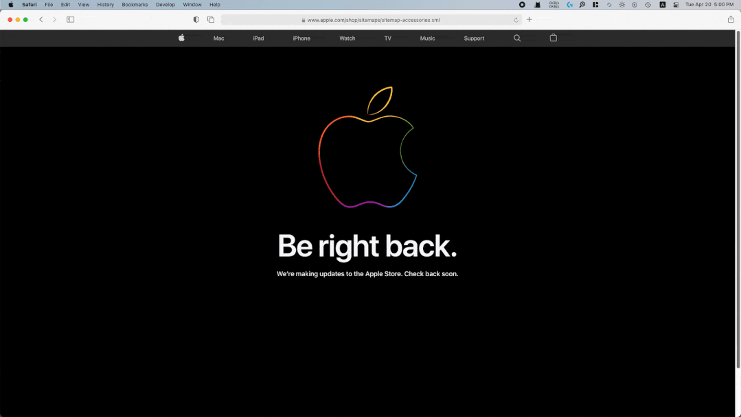 苹果的春季发布会将在明天 (4 月 21 日) 凌晨 1 点正式召开,目前也有网友发现苹果官网商城的网站地图页面已经开始维护,商城主页面和其余部分相信很快也会开始进行维护。