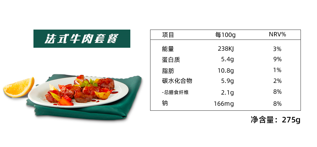拿欢迎程度top10的午餐菜品法式牛肉打比方,热量650kcal,占了一天热量的大头,才能满足白天高强度的工作,不至于饥肠辘辘老想吃零食。