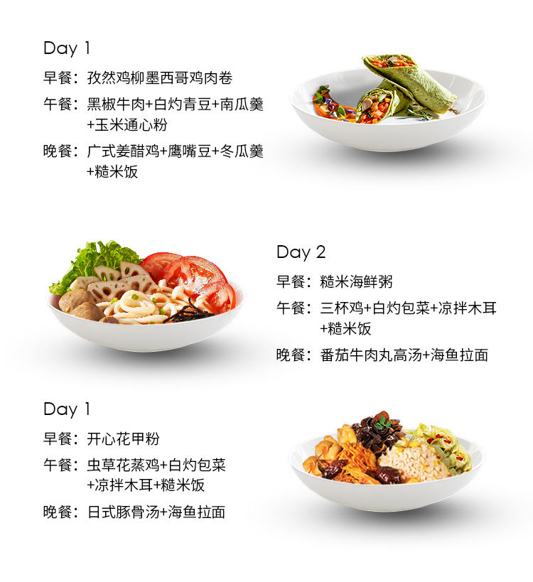 小黑盒把每一顿都已经分配标注清楚了,虫草花蒸鸡、开心花甲粉、番茄牛肉丸拉面,都是实实在在、看得见的食材,菜式丰富到完全不重样!
