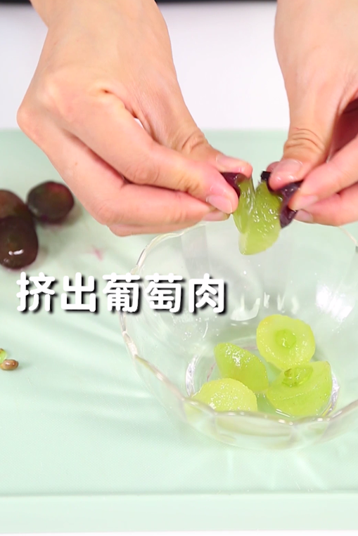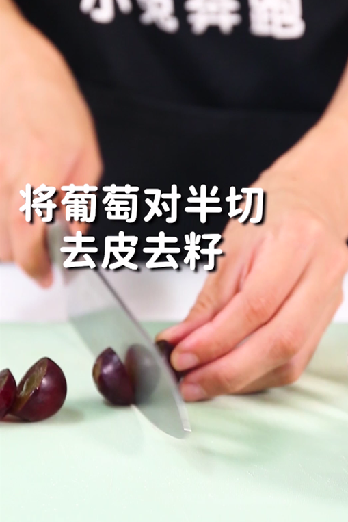 第1步:将巨峰葡萄对半切开,去皮去籽,然后挤出果肉备用