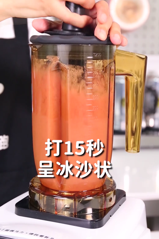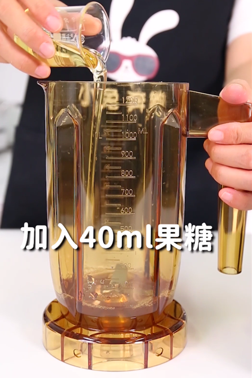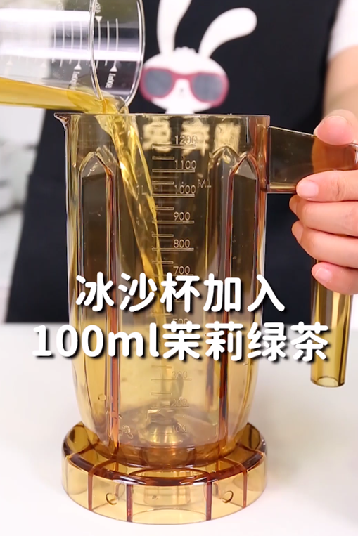 第2步:冰沙桶中加入100毫升的茉莉绿茶底、40毫升果糖、80毫升葡萄汁,再加入冰块到550毫升的刻度线,然后打15秒呈冰沙状态