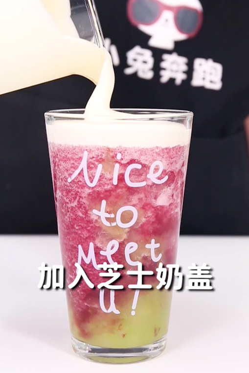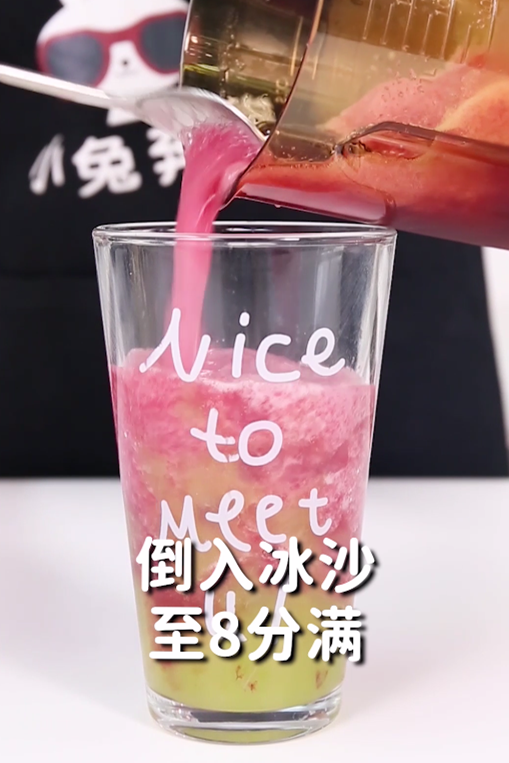 第4步:将打好的冰沙倒入出品杯中至八分满,再加入芝士奶盖至满杯,这款饮品就做好啦