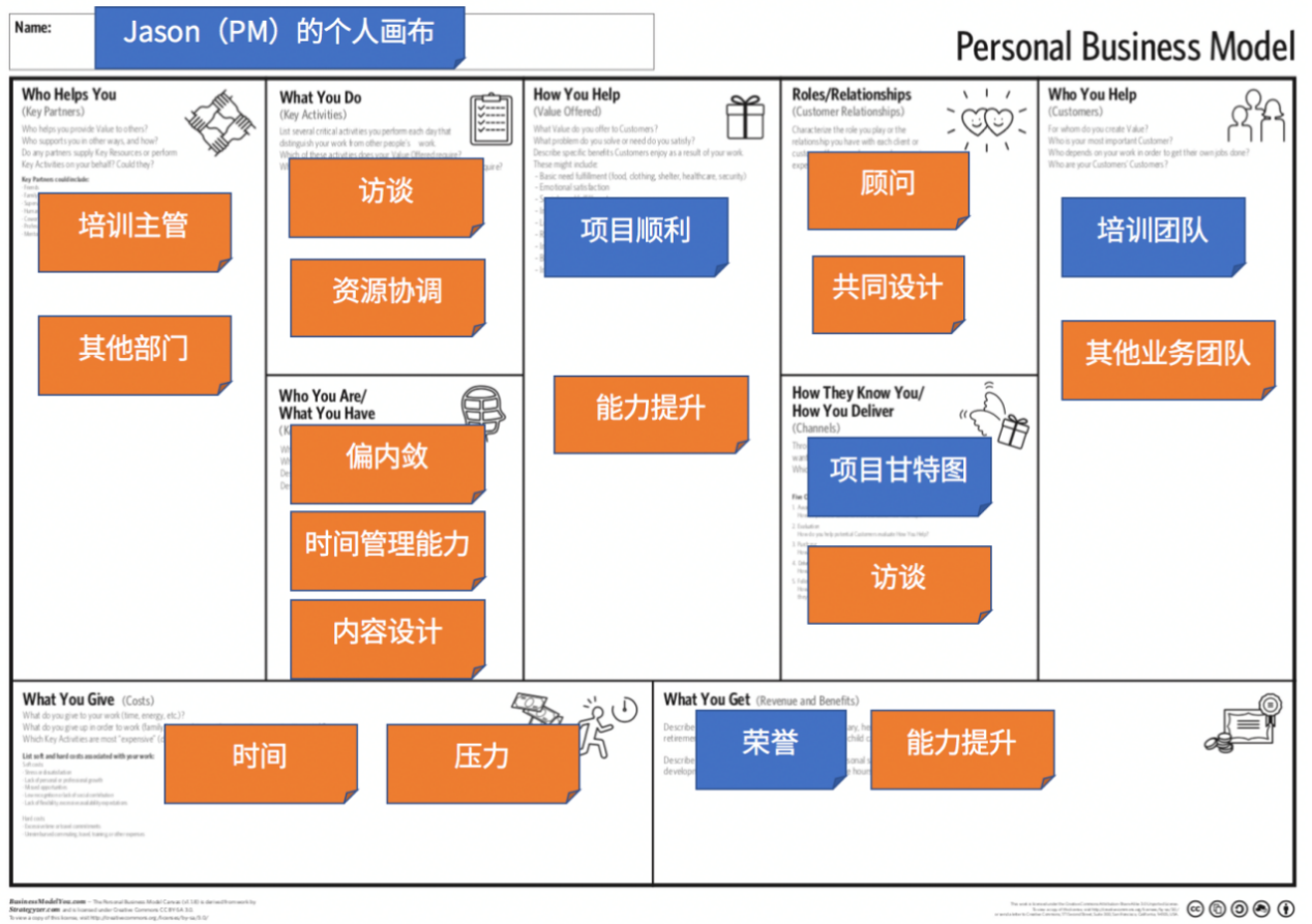 图表7|某电梯生产企业研发中心培训团队一位项目主管Jason的个人画布