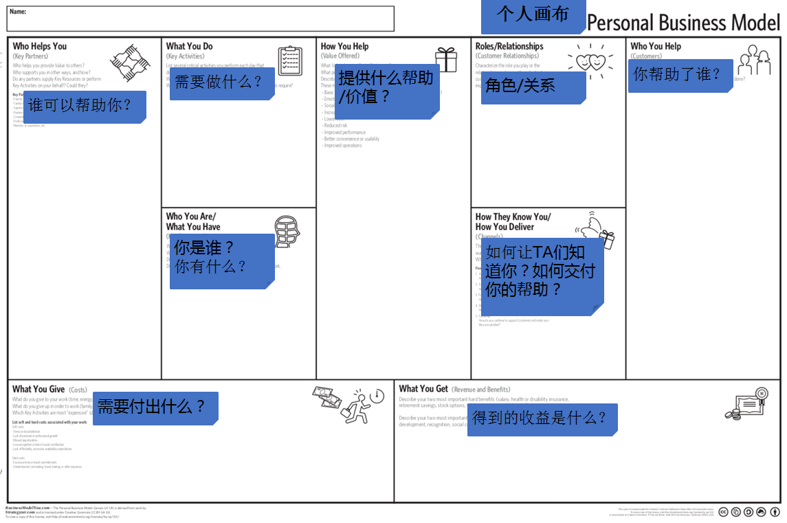 在个人画布中,每个模块的思考方向和内容与团队画布相同。只是在核心资源这个模块,个人画布主要从“我是谁,我有什么”来思考。“我是谁”包括个性、技能、兴趣点等方面;“我有什么”包括资金在内的有形资源,以及人脉等无形资源。