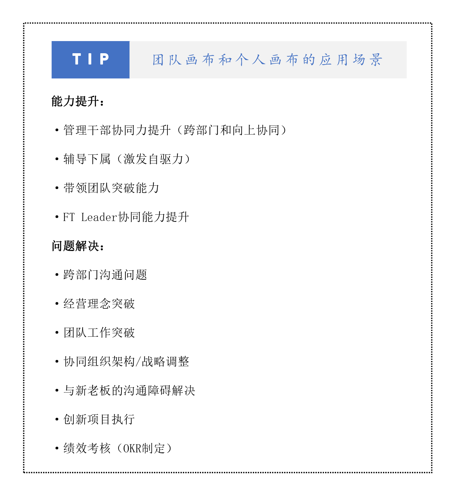 团队画布和个人画布作为团队辅导的有效工具,在管理干部能力提升和问题解决两方面都有很多应用场景(见TIP)。