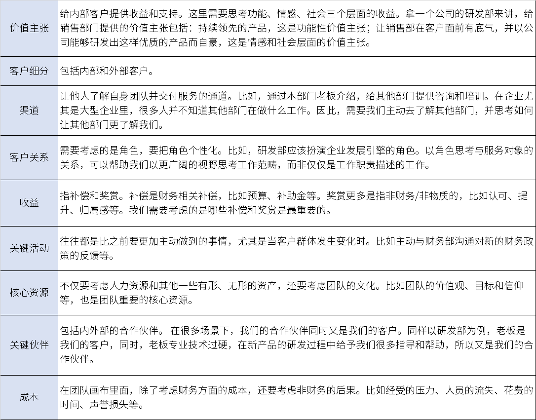 在企业里面,大部分部门都不会直接与外部客户打交道,而是服务于内部客户,如老板、其他部门等。针对这些内部客户,团队画布(见图表3)和个人画布(见图表4)在九个格子里有着与商业画布不同的思考。