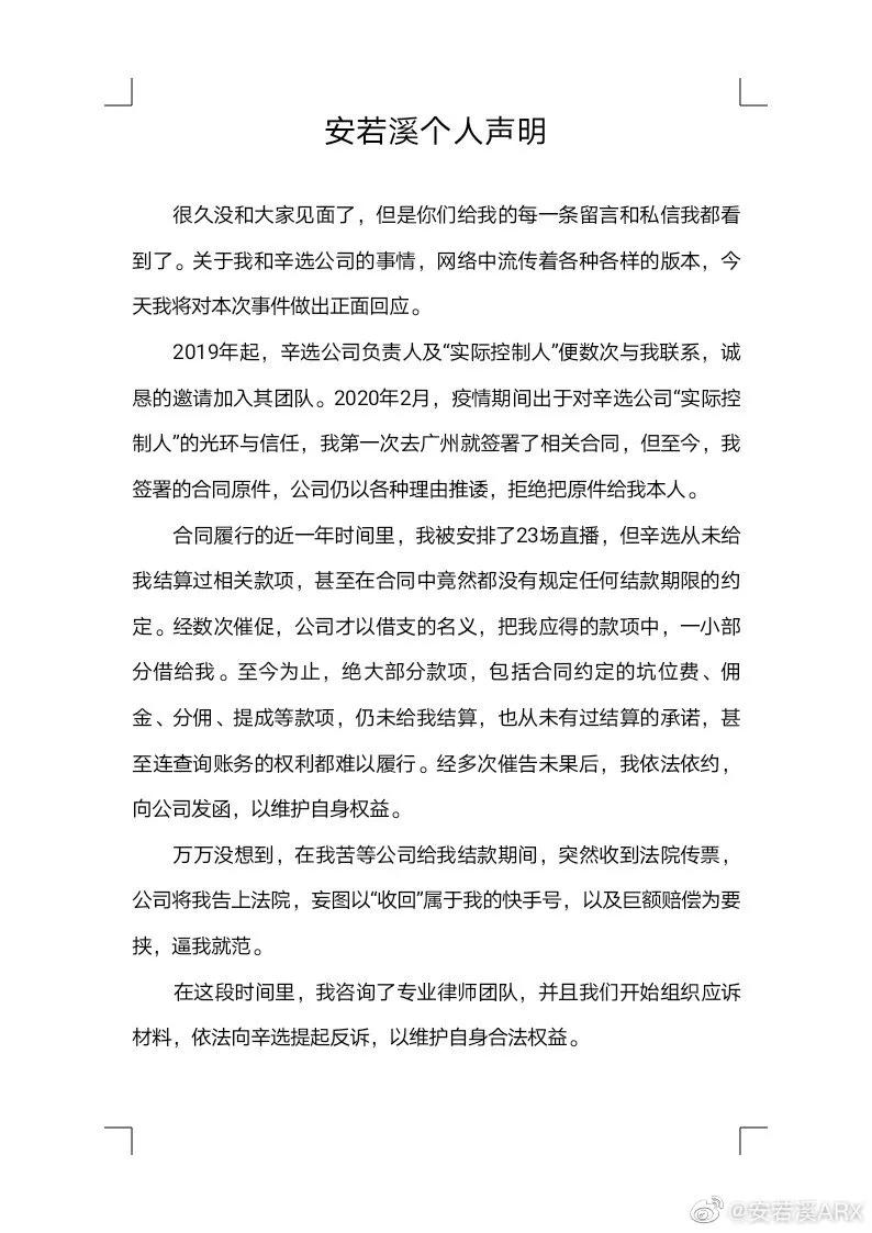 起因是辛巴的前徒弟、在快手拥有962万粉丝的安若溪就辛选公司“拖欠自己应得款项”发函,没想到反被辛选告上法庭,随后安若溪进行了反诉,称辛选公司拖欠其应得收入2650余万元,索赔包括工作收入款项、滞纳金及赔偿共近6700万元。