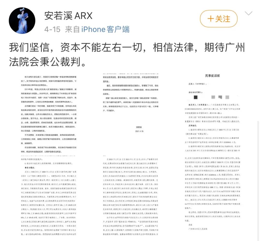 4月15日,安若溪(本名:安丽萍)通过微博发声明称,“我们坚信,资本不能左右一切,相信法律,相信广州法院会秉公裁判”。