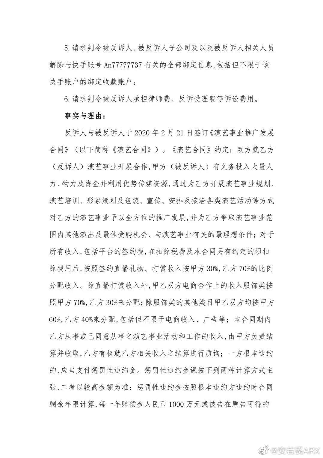 在安若溪微博发布的民事反诉状中,清晰写道,对于所有收入,包括(快手)平台的签约费,在扣除税费及本合同另有约定的须扣除费用后,按照签约直播礼物、打赏收入按甲方(辛选)30%,乙方(安若溪)70%的比例分配收入。