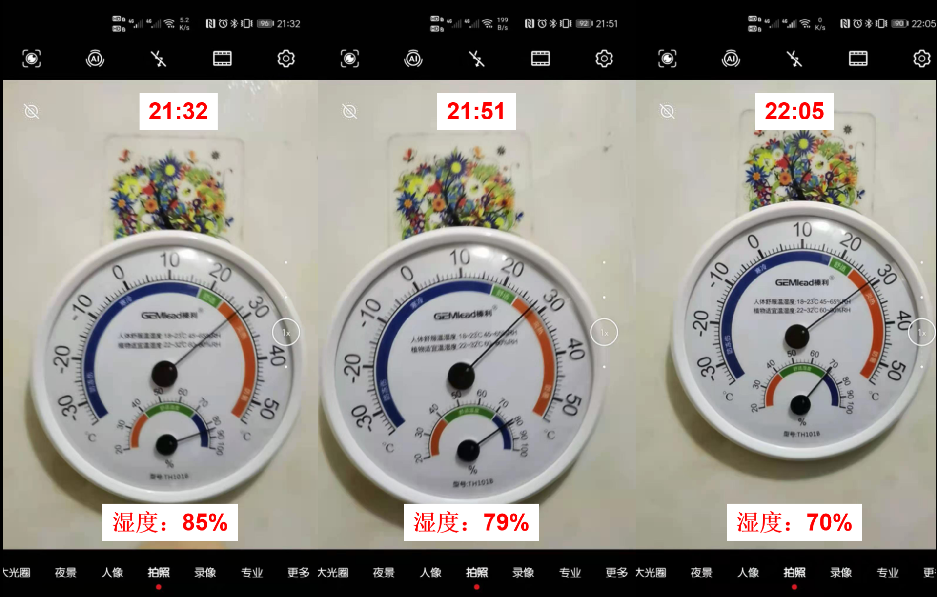 特地在浴室试了一下,一个3平米的浴室,洗完澡后浴室的湿度高达85%。然后19分钟内下降到79%,再过14分钟左右,下降到了70%,完全达到了一个较为舒适的程度。整个浴室的地板也干了很多。