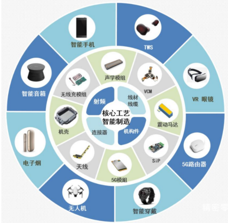 无论是通信或是汽车业务,均充分受益于早期立讯精密在消费电子领域积累的强大制程、研发、品质及业务等综合能力,相关成熟经验及多种资源在不同领域之间产生充分协同。公司依循未来需求特别在声学、视觉、电源(有线/无线)、无线通信技术等领域深度布局,相关产品广泛应用于多类消费电子及汽车业务。近年来,在系统组装业务领域持续重构供应链,主要产品包括智能可穿戴、智能家居、智能显示等。