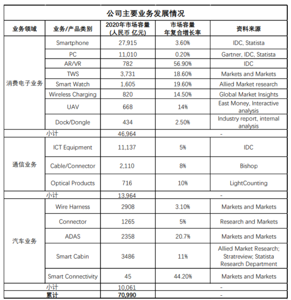 从市场容量看,2020年立讯精密消费电子业务市场容量为46,964亿元,通信业务为13,964亿元,汽车业务为10,061亿元,累计市场容量达70,990亿元。