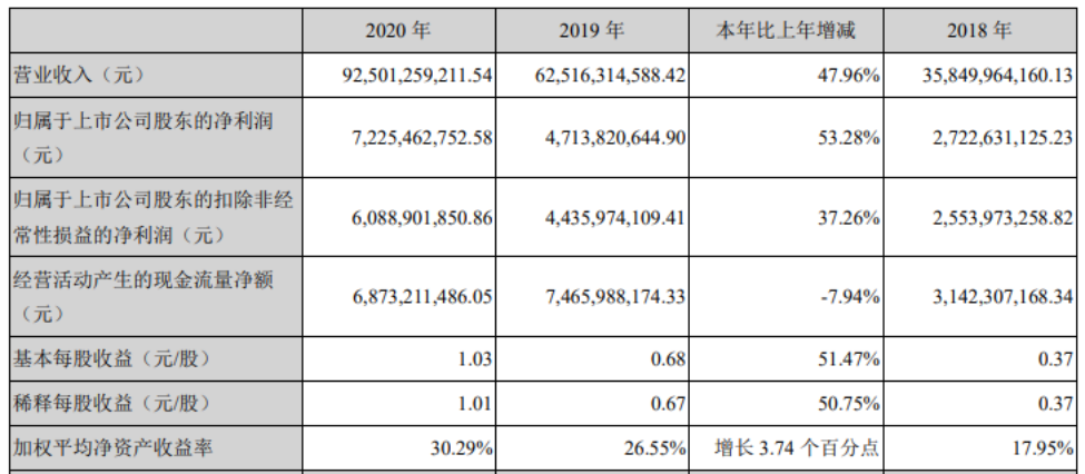 4月20日晚间,立讯精密披露了2020年年度业绩报告。数据显示,其实现营业收入为925.01亿元,同比增长47.96%;归属于上市公司股东的净利润约为72.25亿元,同比增长53.28%;基本每股收益盈利1.03元,同比增长51.47%。