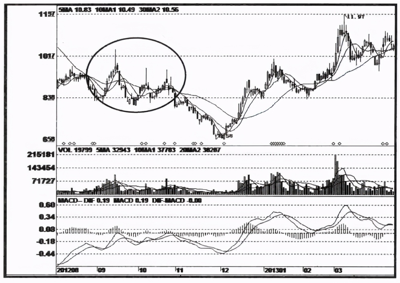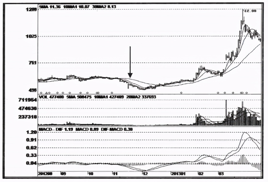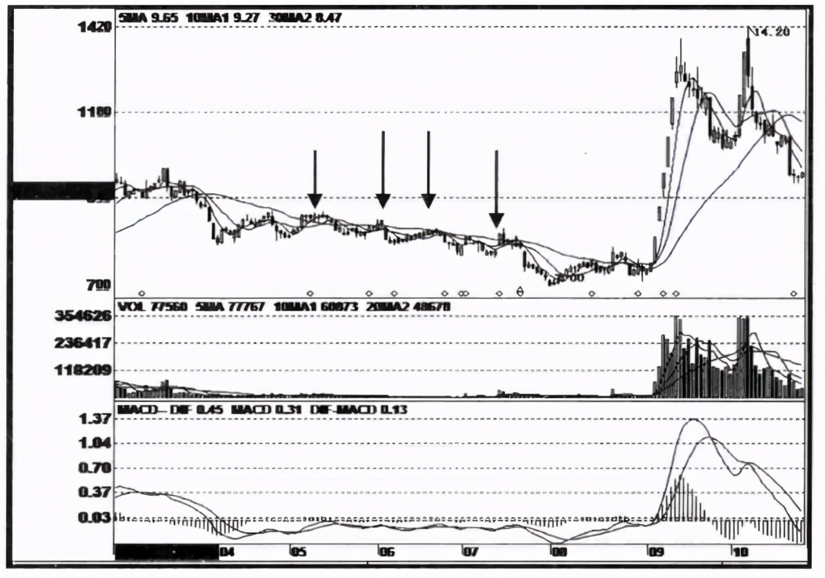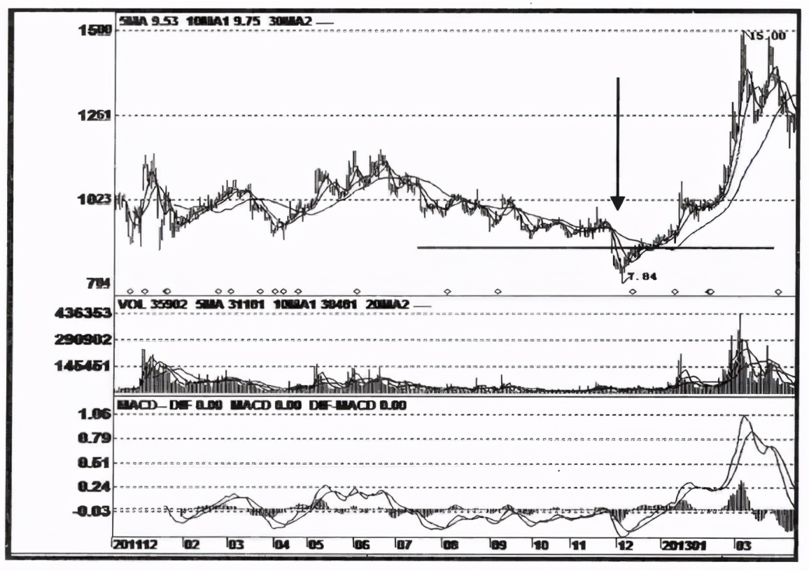 图41,中海科技(002401):庄家在建仓过程中,多次测试均线的阻力程度,通过盘面的量价变化可以看出,当股价突破或触及均线时,没有吸引更多的跟风盘,同时在均线附近遇到很大的压力。由此可以看出庄家的快速大幅拉升时机还不成熟,所以庄家后来选择继续下跌,以进一步夯实底部基础。2012年8月21日,股价再次向上突破均线时,成交量有所放大,表明市场底部基本得到确认。再经短暂的调整后,股价出现暴涨行情。