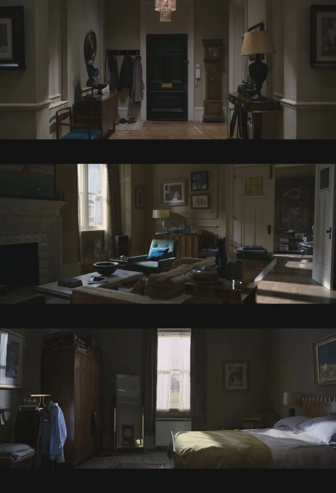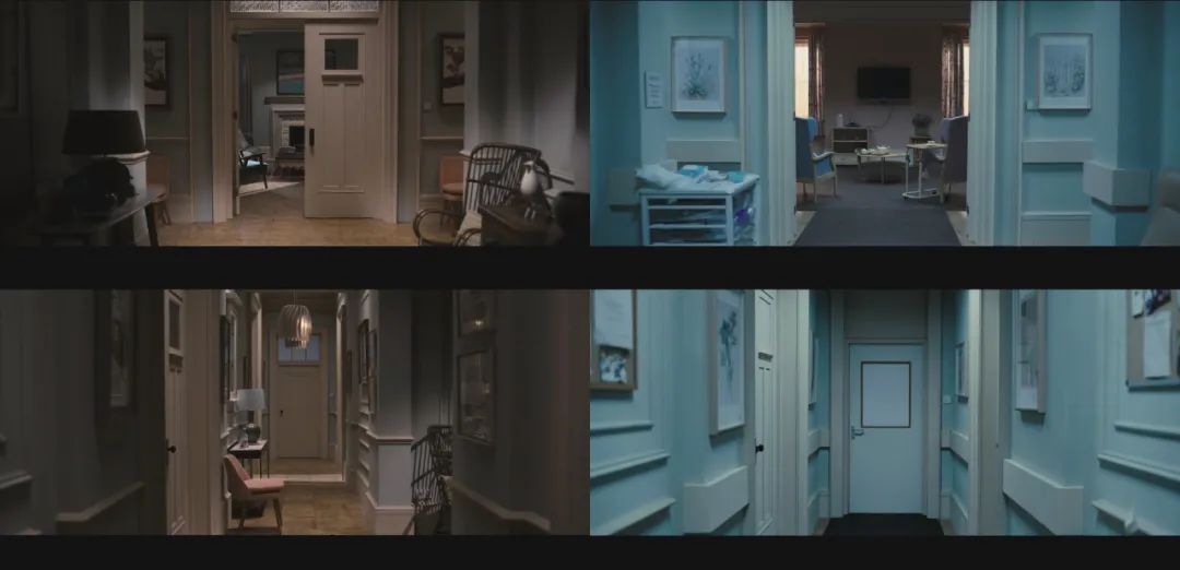 因为是室内剧电影,场景环境较为单一局限。室内结构大致由客厅、卧房、走廊等小场景构成,同一化的小场景又组成三个不同的大环境(父亲的公寓,女儿的公寓,以及养老院),从而造成不知身处何地的混淆感。