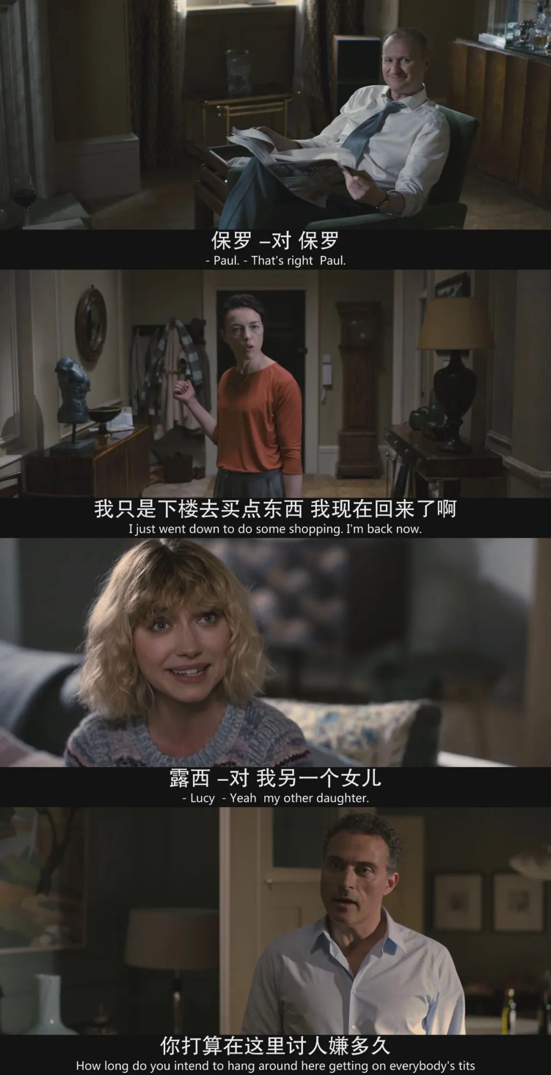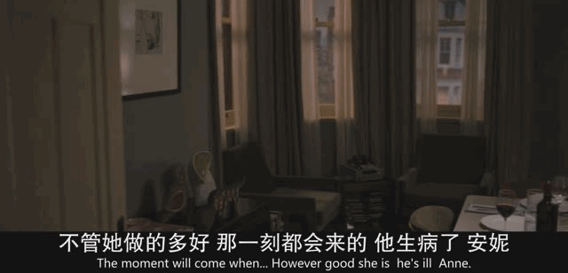 当女婿跟女儿安妮建议,将岳父送进养老院时,父亲在屋外恰巧听到夫妇的对话。在处理这一场景时,导演用了情节的重复,以确认女婿对于岳父的嫌弃,从而强化了安东尼悲苦的晚年处境。