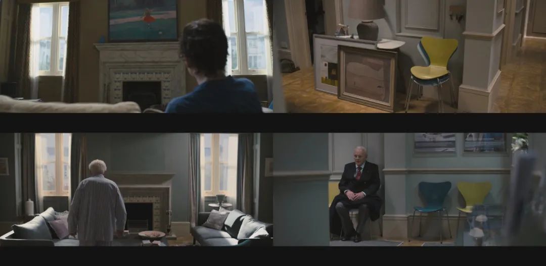 客厅墙面上小女儿画的画,在养老院大厅中并不存在;公寓走廊的黄色座椅,也同样出现在养老院走廊中。两处细节都暗示观众,此时的父亲可能是处于记忆错乱的边缘。