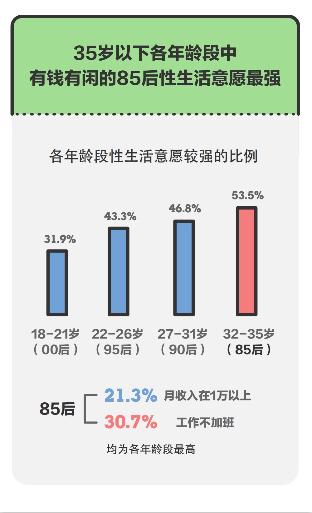 此外,性生活以及结婚成家的意愿最强烈的年龄段已经被推延至32-35岁这个阶段。接受教育程度越高的人群,结婚越晚已经成为一种社会现状。