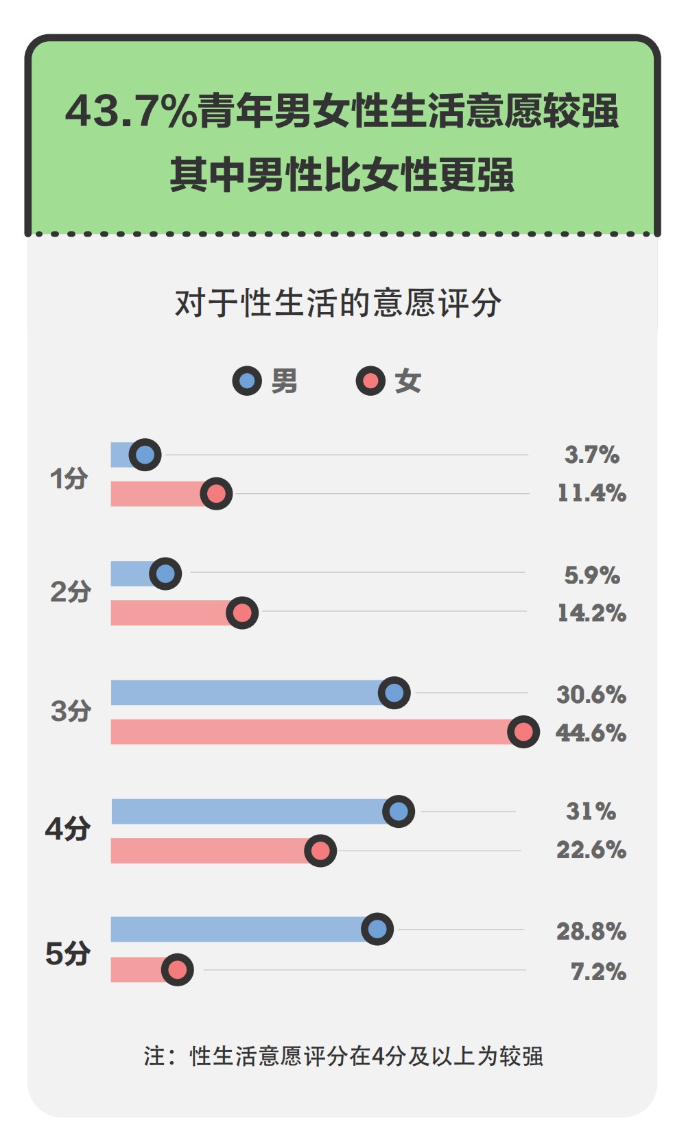 报告中统计的数据表明,56.3%的男女青年对性生活的意愿并不强烈。