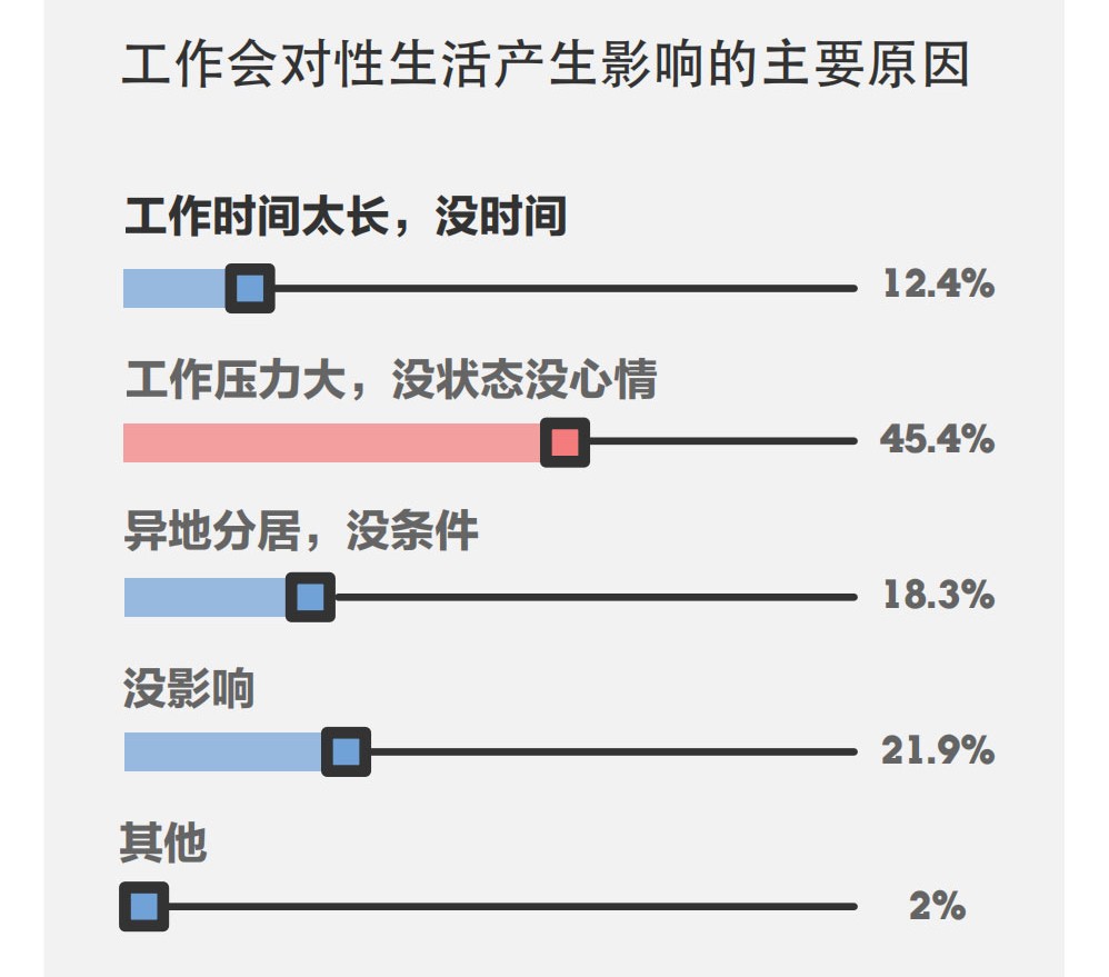 而工作对年轻人的性生活影响也超乎所有人的想像。高达57.8%的人认为是工作让他们失去了对性伴侣的激情。其中12.4%的年轻人受加班影响,没时间过性生活,另外45.4%的人则是因为工作的压力太大,完全没有心情过性生活。