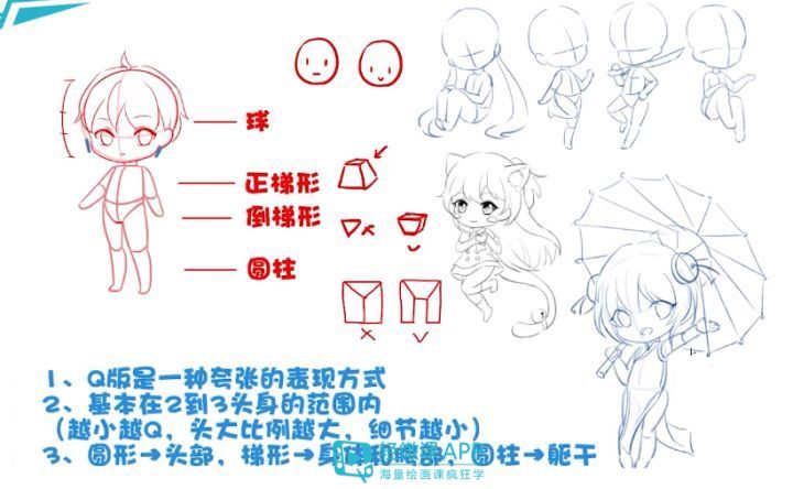 今天跟大家分享一下萌萌的Q版的画法,Q版是一种夸张表现方法主要凸显人物的Q萌还可爱,所以我们用比较原画这种线条来画Q版,Q版基本在两到三头身的范围内,如果是五头身那就是比较接近小孩子的真实比例看上去就没有那么Q了。
