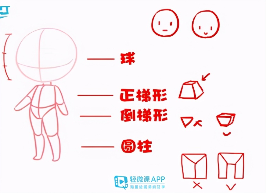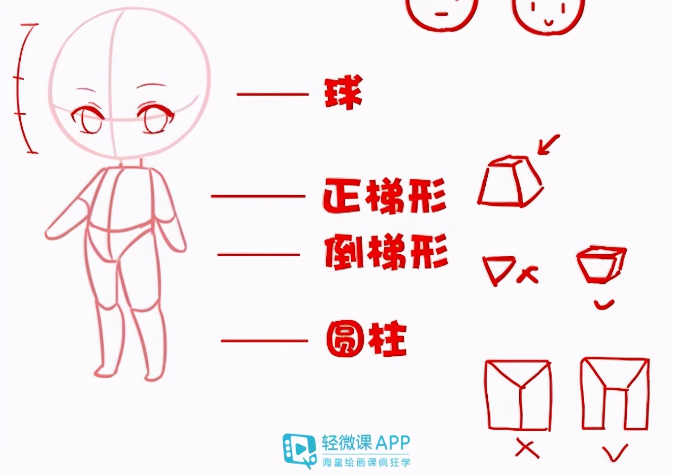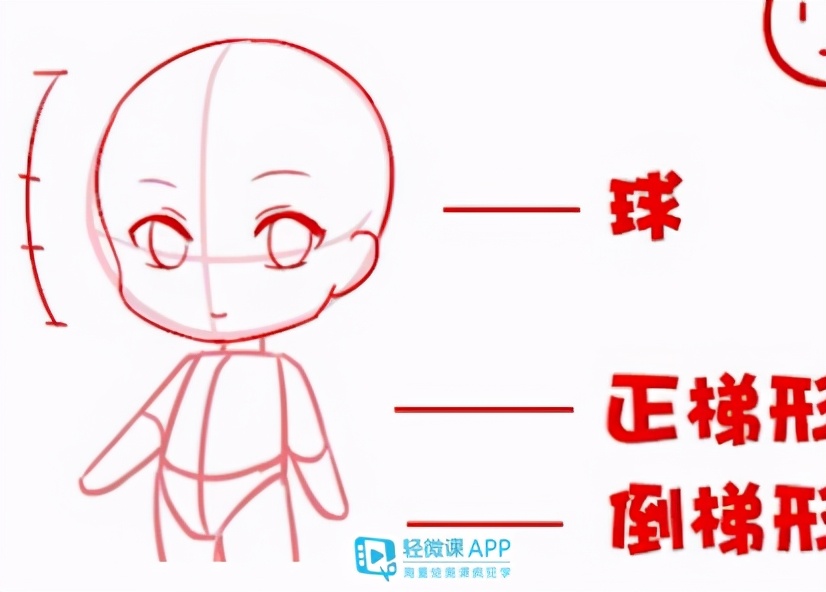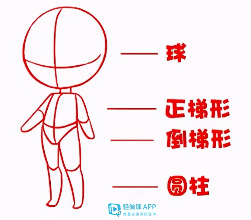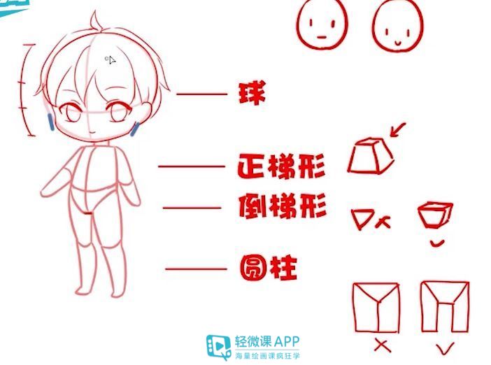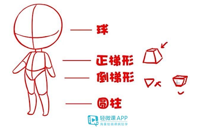 在画Q版一开始可以先用圆来代表头部,然后用梯形代表身体还有胯部