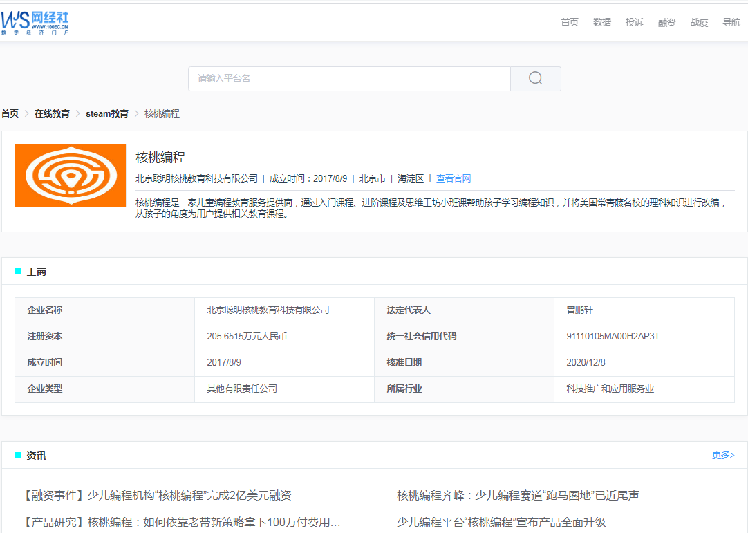 据网经社企业库(COP.100EC.CN)显示,核桃编程,成立于2017年8月,隶属北京聪明核桃教育科技有限公司,法定代表人曾鹏轩,是一家儿童编程教育服务提供商,通过入门课程、进阶课程及思维工坊小班课帮助孩子学习编程知识,并将美国常青藤名校的理科知识进行改编,从孩子的角度为用户提供相关教育课程。