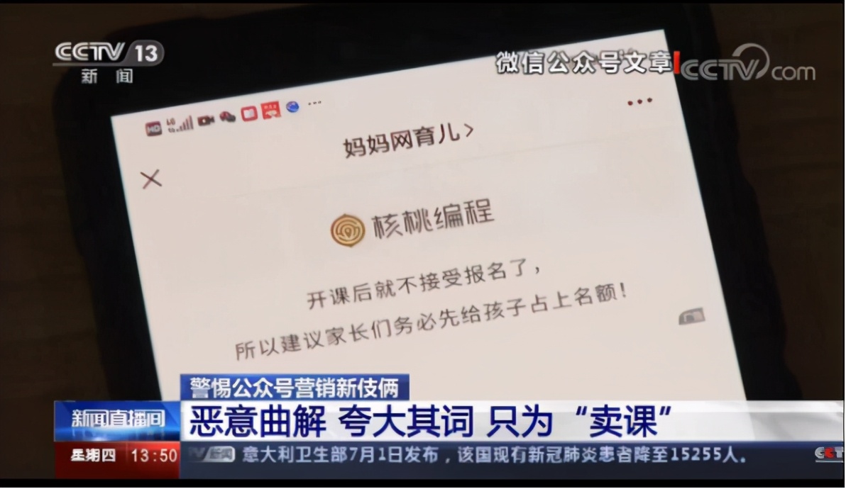 网经社“教育台”(EDU.100EC.CN)获悉,此次陷入“短信骚扰投诉”并不是核桃编程第一次被点名,早在2020年7月核桃编程就因在微信公众号文章中以“标题党”的形式诱导家长点开文章宣传线上课程产品被指为“虚假营销”,遭到央视点名批评为达到授课目的疯狂向家长贩卖焦虑。
