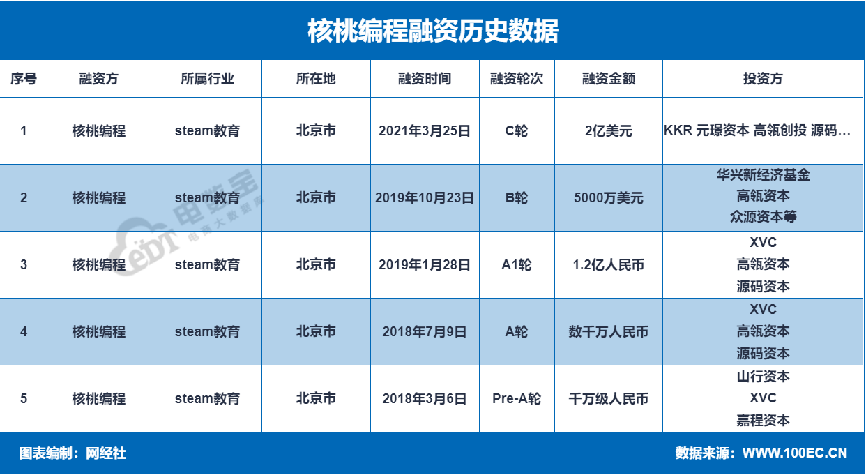 此外,网经社“电数宝”(DATA.100EC.CN)大数据库监测数据显示,在3月25日,核桃编程宣布完成C轮系列融资额约2亿美元,本轮融资由KKR、元璟资本、高瓴创投领投,源码资本、华兴新经济基金等机构继续跟投,凡卓资本担任本轮融资独家财务顾问。本轮融资将在AI教学产品建设、优质师资储备与教研体系等方面进行持续投入。