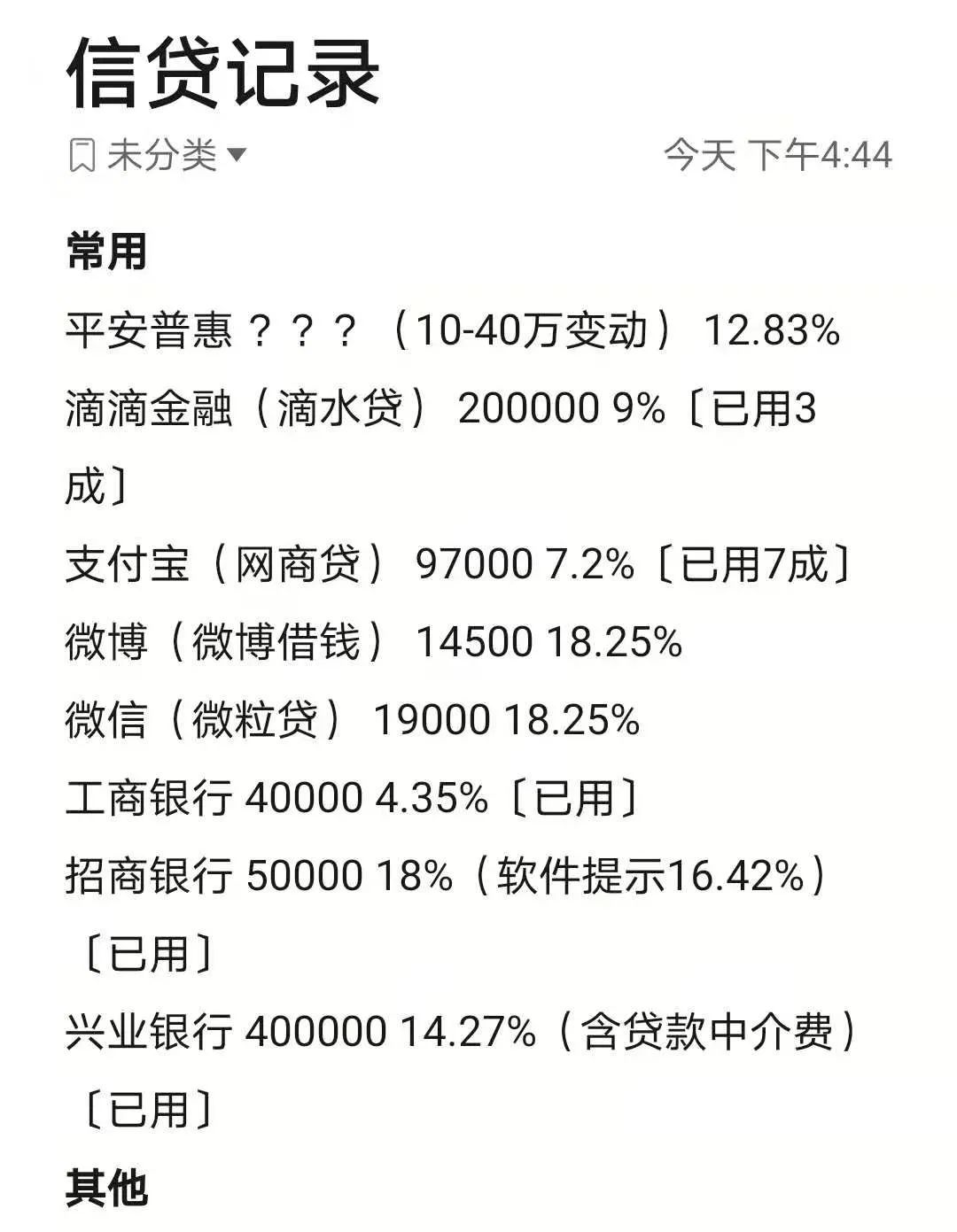 (以上数据仅代表我个人,实际情况中每个人的贷款额度与利率应该都是不相同的,其他十来个不常用平台隐去)