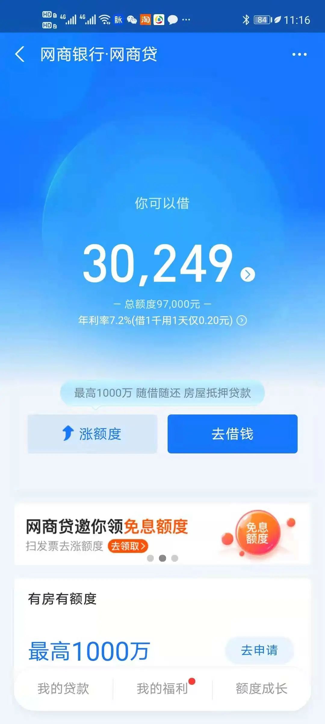 支付宝是我借的第一笔信贷,相信也是很多人借钱时能想到的第一选择。支付宝的信贷服务是通过网商贷产品实现的,实际放款由网商银行提供。对于互联网行业的人来说,这两者的关系是不需要科普的。利率不高,而给到97000元的额度足够支撑我司一些小项目上的资金需求。