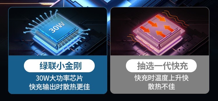 核心配置上,绿联小金刚采用30W大功率芯片,轻松承载20W、18W功率输出,实测30分钟可为iPhone 12充60%电量,为iPhone11、iPhoneX等机型充到50%电量。由于芯片功率余量大,避免了负载满额的情况,加上智能温控技术的应用,使得充电过程中散热更快,温升相对普通PD充电器降低了6-7℃。