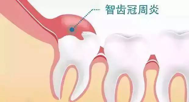 由于多数智齿萌出不完全,牙冠的一部分被牙龈包绕,形成盲袋,食物残渣易进难出,导致冠周软组织红肿、盲袋积脓,患者会有疼痛、开口困难、发热等症状。冠周炎可反复发作,严重时会出现颌周间隙感染、下颌骨骨髓炎等。