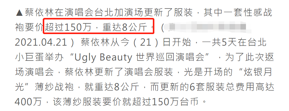 蔡依林穿约35万衣服!全身镶满昂贵水晶,一套高十六斤