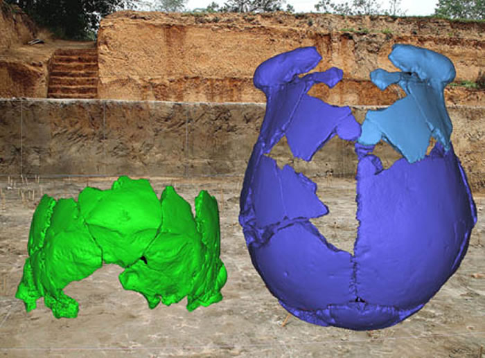 ▲河南灵井遗址发现的许昌人1号(右侧)和2号(左侧)头骨化石(图/吴秀杰)
