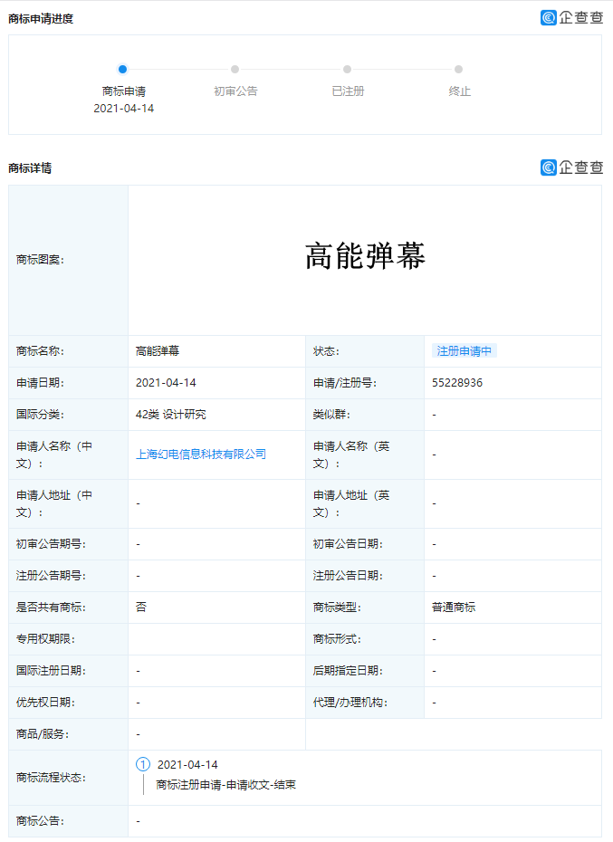 IT之家 4 月 22 日消息 企查查 App 显示,近日,B 站关联公司上海幻电信息科技有限公司新增“神弹幕”、“高能弹幕”商标申请信息,国际分类涉及设计研究,目前商标状态均为“注册申请中”。