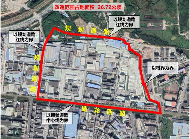 本项目位于东莞市塘厦镇田心社区,东至田心-莆心湖村界,南至塘龙西路,西以规划道路红线为界,北以规划道路红线为界,改造范围总占地面积约26.72万㎡(约400.80亩)(具体以政府有关部门的批复为准)。