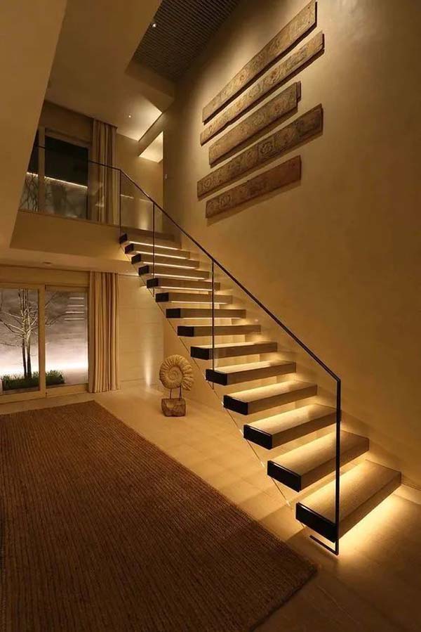 对于拥有楼梯的户型来说,在楼梯中加入条状灯带能起到很好的装饰效果。搭配在房间四角散落的小射灯,房间变得温馨又梦幻,夜间享受多又多。
