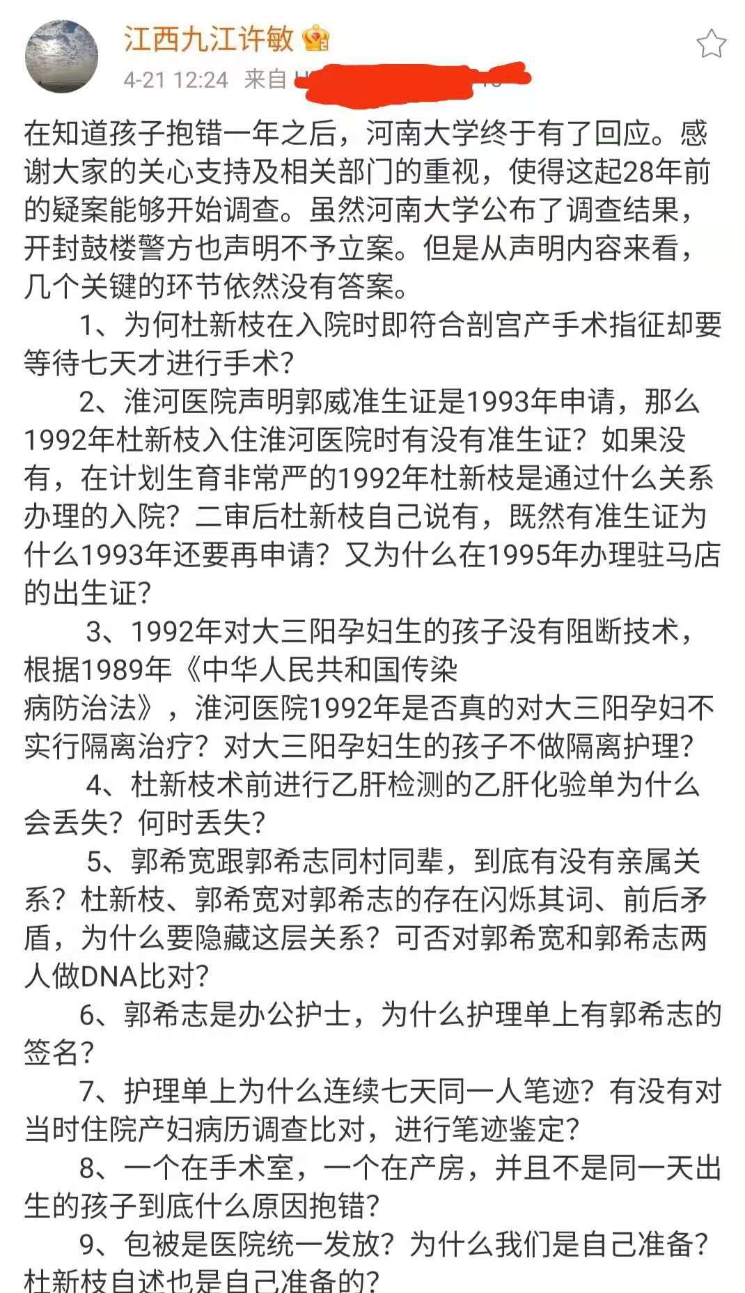 随后许敏发布了11点疑问,很多问题都直指两份声明,可以说句句扎心,字字啼血。其中提到5、郭希宽跟郭希志同村同辈,到底有没有亲属关系?杜新枝、郭希宽对郭希志的存在闪烁其词、前后矛盾,为什么要隐藏这层关系?可否对郭希宽和郭希志两人做DNA比对?6、郭希志是办公护士,为什么护理单上有郭希志的签名? 9、包被是医院统一发放?为什么我们是自己准备?杜新枝自述也是自己准备的?10、1992年淮河医院识别孩子身份是包被上的圆牌?当时新生儿出生是否戴手环?